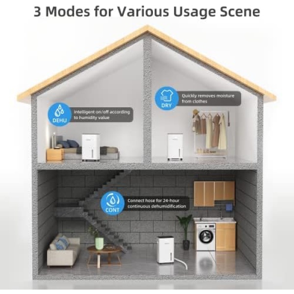 3 MODE EFFICIENT DEHUMIDIFIERS – Three modes with one click to accurately meet your different needs. The DEHU mode keep the humidity level of your home in a healthy range or be used in wine cellars and storage rooms where there is a clear need for space humidity. The DRY mode can quickly dry wet clothes and cotton household items and protect clothes from moisture. The CONT mode is suitable for constantly damp spaces where continuous dehumidification is required.