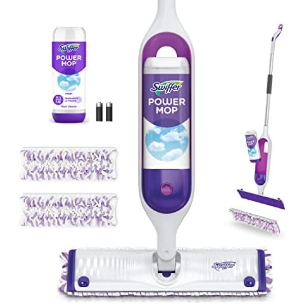 Mop smarter with the Swiffer PowerMop, an all-in-one mopping system that gives you a mop and bucket clean in half the time. The multi-surface mopping pads have 300+ scrubbing strips that reach deep into grooves and grout to remove sticky spills and daily dirt and grime. The fresh scent of PowerMop solution will fill your home with freshness for hours. Some assembly required; batteries included. vs. mop and bucket – includes cleaning and drying time Leaves behind up to 2 hours of freshness after initial product use